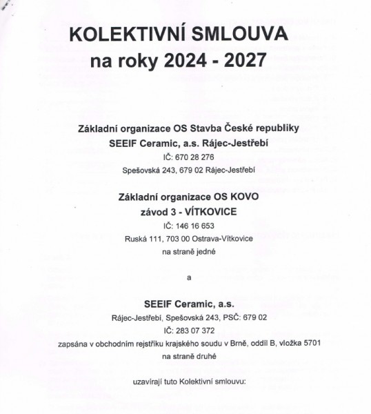 Kolektivní smlouva SEEIF Ceramic a.s. 2024-2027